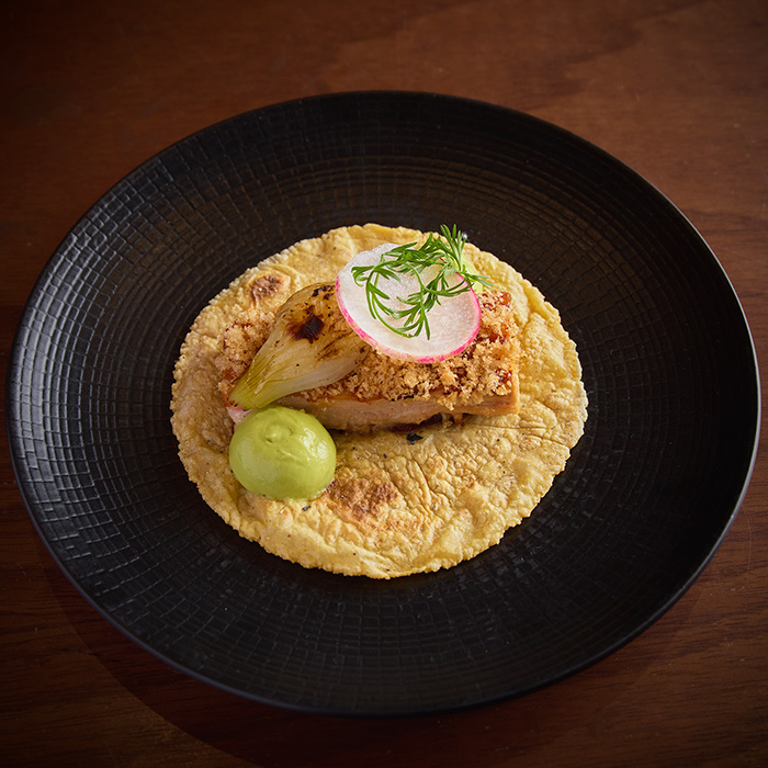(1 pza) (80 g) Cremoso de aguacate, chicharrón y rábano cambray